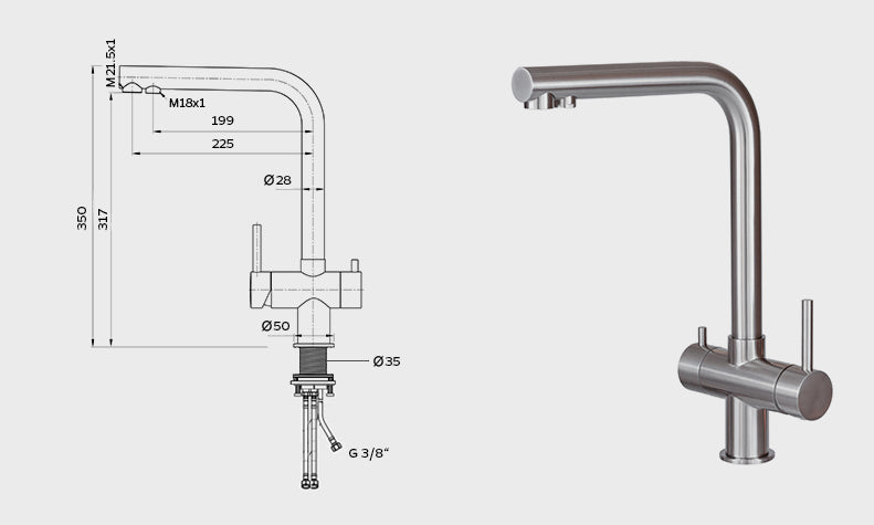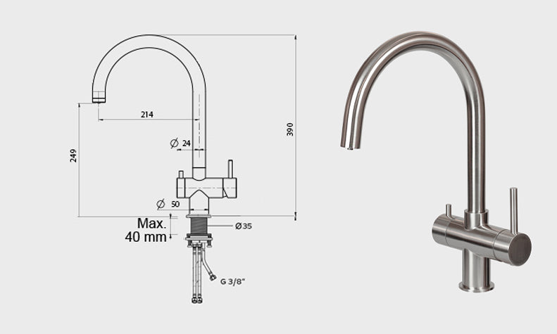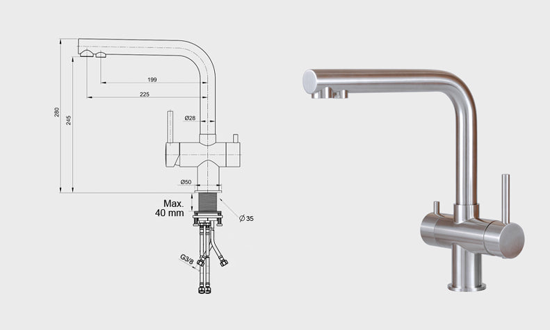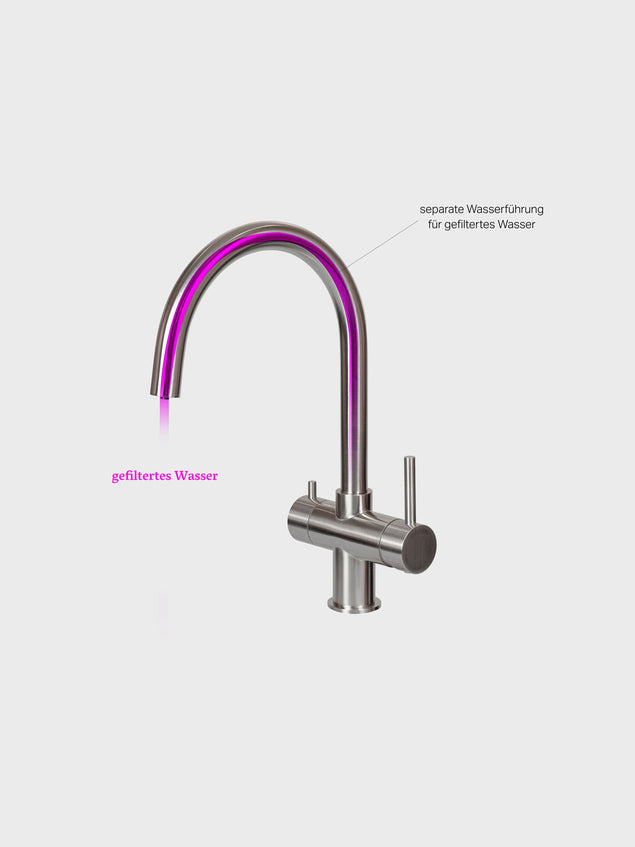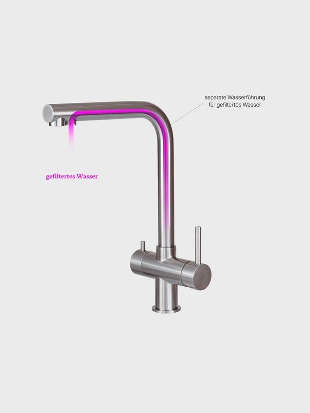Hygiene: Unsere Hochleistungsfilter entfernen nicht nur Schadstoffe, sie sind zudem bakterien- und virensicher. Daher ist eine hygienische Trennung vom normalen Brauchwasser wichtig, um diese Sicherheit zu gewährleisten und die Hygiene im Filtergehäuse zu bewahren. - Wann wähle ich die separate Armatur?Eine separate Armatur kann in jeder Küchensituation montiert werden. Bestehende Armaturen, Sonderfunktionen, Boiler etc. bleiben davon unberührt. Mit einem T-Stück wird die gesamte Installation des Filtersystems ab dem Kaltwasser Eckventil von der Küchenarmatur getrennt. Wir empfehlen die separate Armatur, sollten Kinder im Haushalt leben oder für Büros und Kitas, da ein neuer separater Wasserhahn sich selbst erklärt, eine klare Trennung zum normalen Brauchwasser darstellt und gut gereinigt werden kann. Bitte beachte, dass ein Loch von ø 14 mm in der Küchenplatte nötig ist. Solltest Du eine Steinplatte haben muss ein Bohren durch einen Küchenbauer oder einen Steinmetz erfolgen.