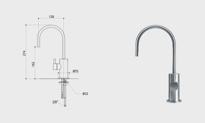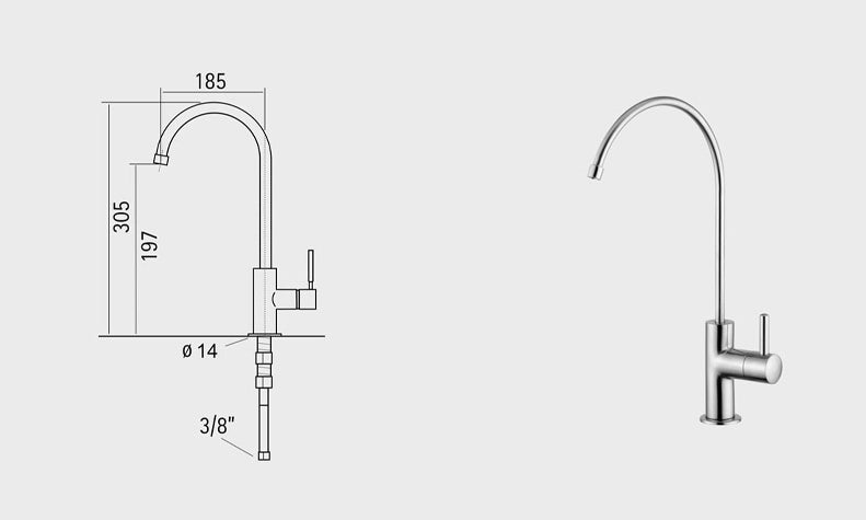 Schlichte separate Armatur aus dem Hause MGS speziell für gefiltertes Wasser aus massivem, korrosionsfestem Edelstahl. Der umweltschonende Herstellungsprozess und die hochpräzise Verarbeitung von Hand zeichnen diese Armatur aus. Der Auslauf ist 360° schwenkbar. Mit dieser Armatur kannst du bei jeder Kücheninstallation leicht LEOGANT Wasser genießen. Hierfür ist ein zusätzliches Loch in der Arbeitsplatte notwendig.
